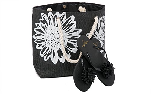 Best Seller! Beach Bag Large Summer Shoulder Shopping Bag Flower Design WITH Flip Flops SET (LRGE-UK7-8, BLACK) Review